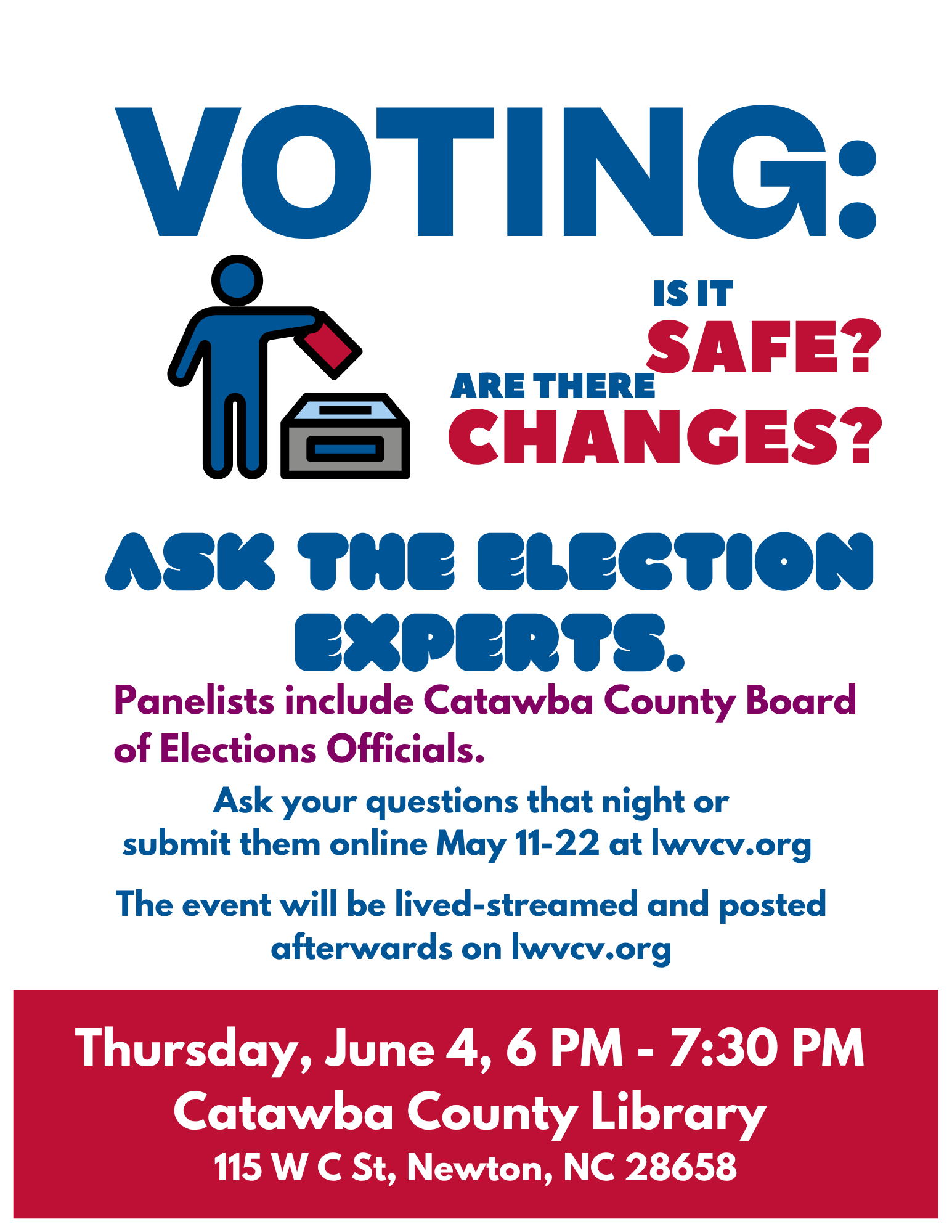 The event will be on June 4 from 6-7:30 PM at the Catawba County Library in Newton. The event is free. Attendees will have the opportunity to have their questions answered that evening. Questions will also be accepted on this page from May 11-22.