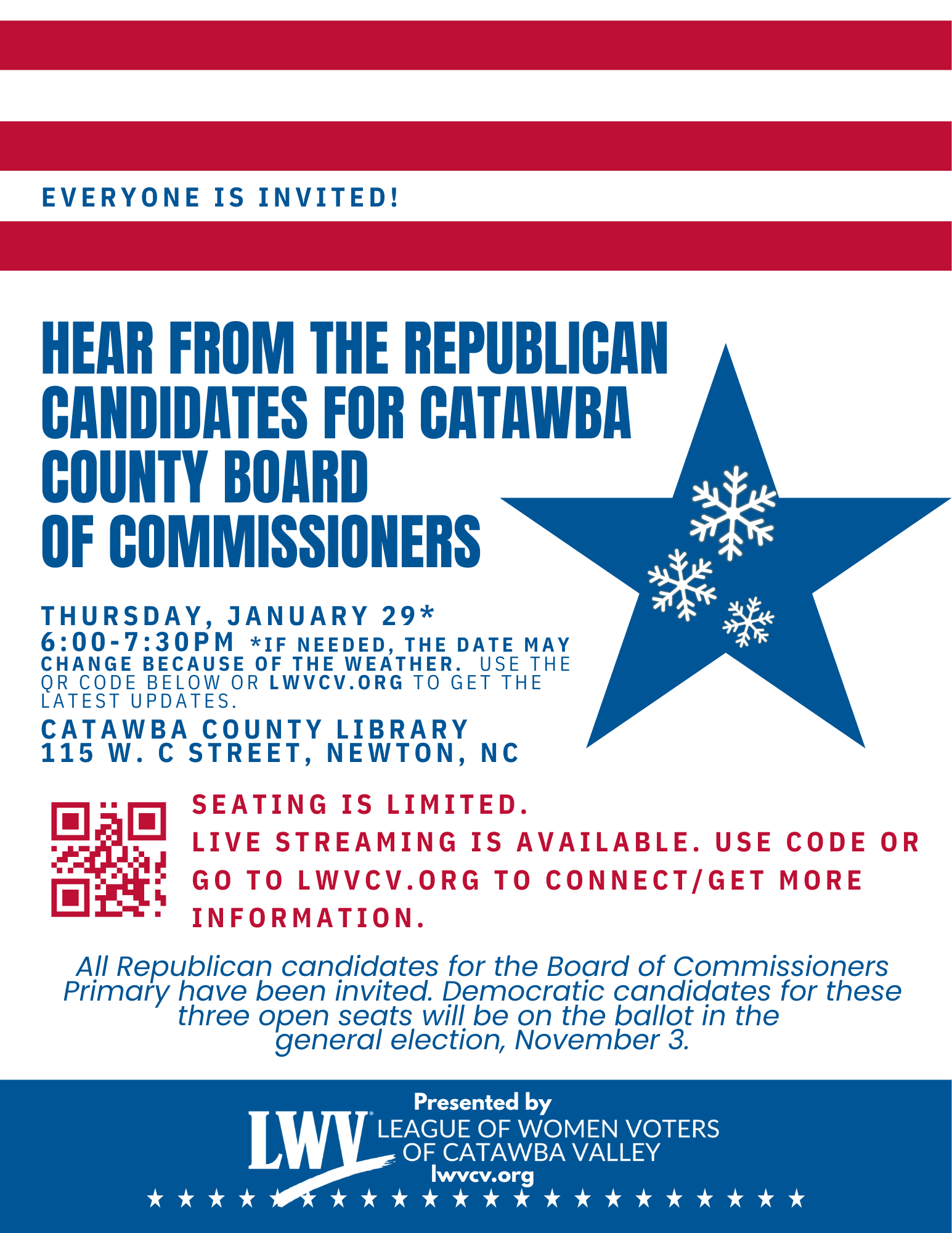 League of Women Voters of Catawba Valley (LWVCV) is a local nonpartisan organization dedicated to empowering voters. The League does not support or oppose any political party or any candidate.