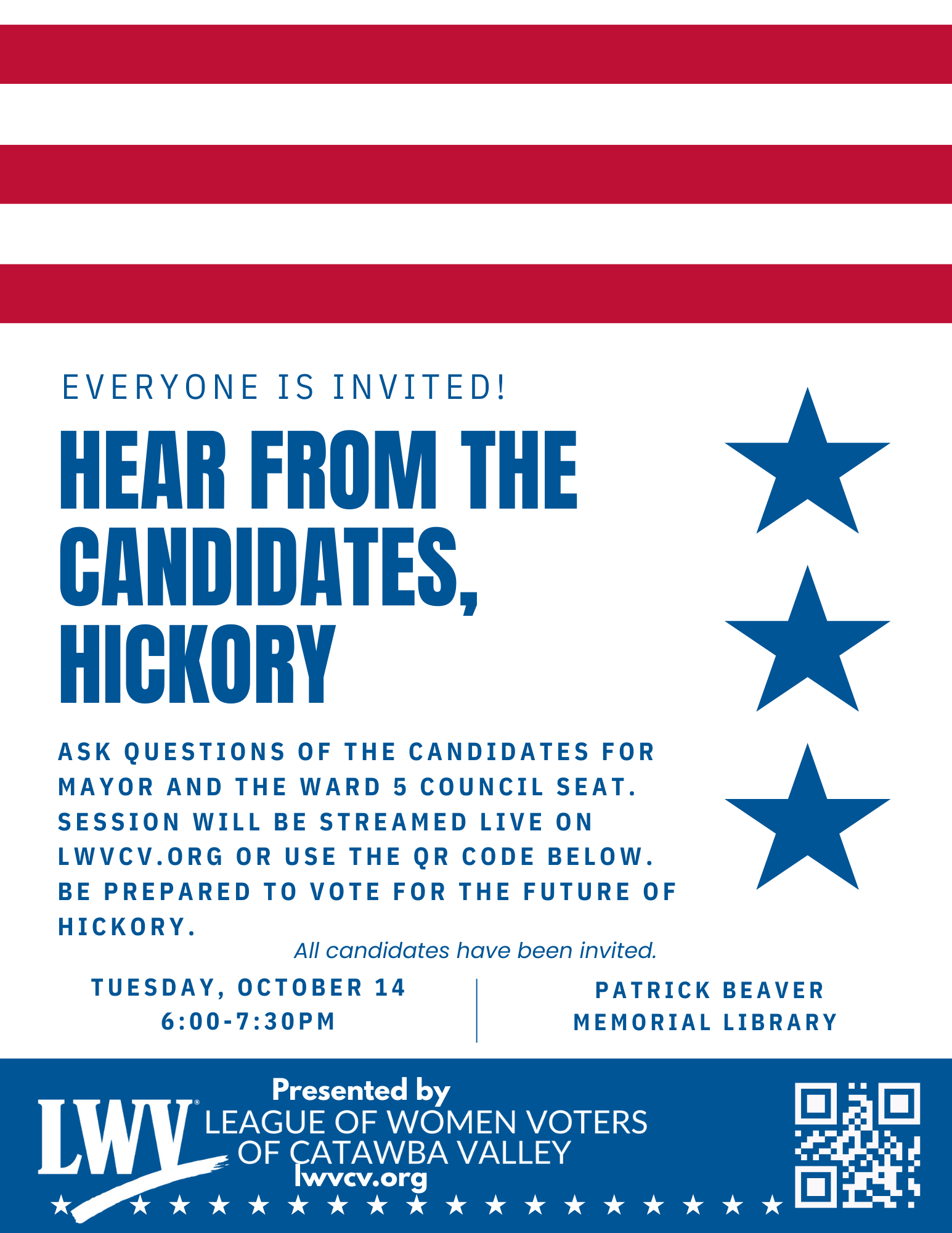 League of Women Voters of Catawba Valley (LWVCV) is a local nonpartisan organization dedicated to empowering voters. The League shall not support or oppose any political party or any candidate.