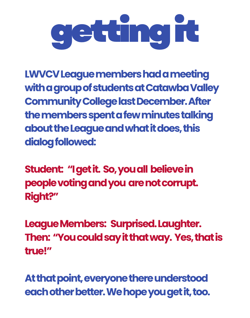 The League of Women Voters of Catawba Valley (LWVCV) is nonpartisan and does not support or oppose any political party or candidates.
